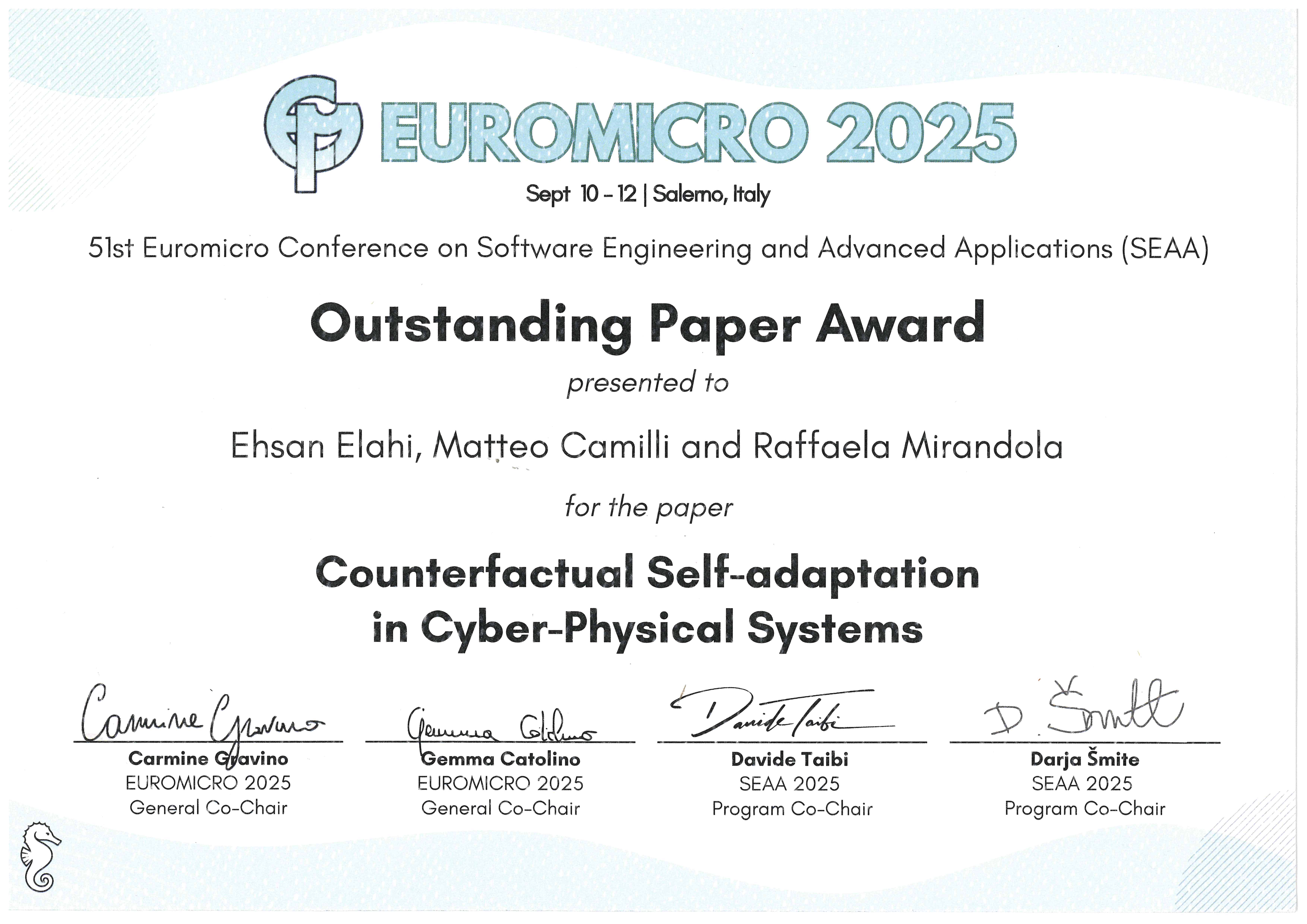 Prof. Raffaela Mirandola won the Most Influential Paper Award at the ACM/SPEC International Conference on Performance Engineering (ICPE) for the paper: “Uncertainties in the Modeling of Self-Adaptive Systems: A Taxonomy and an Example of Availability Evaluation.”